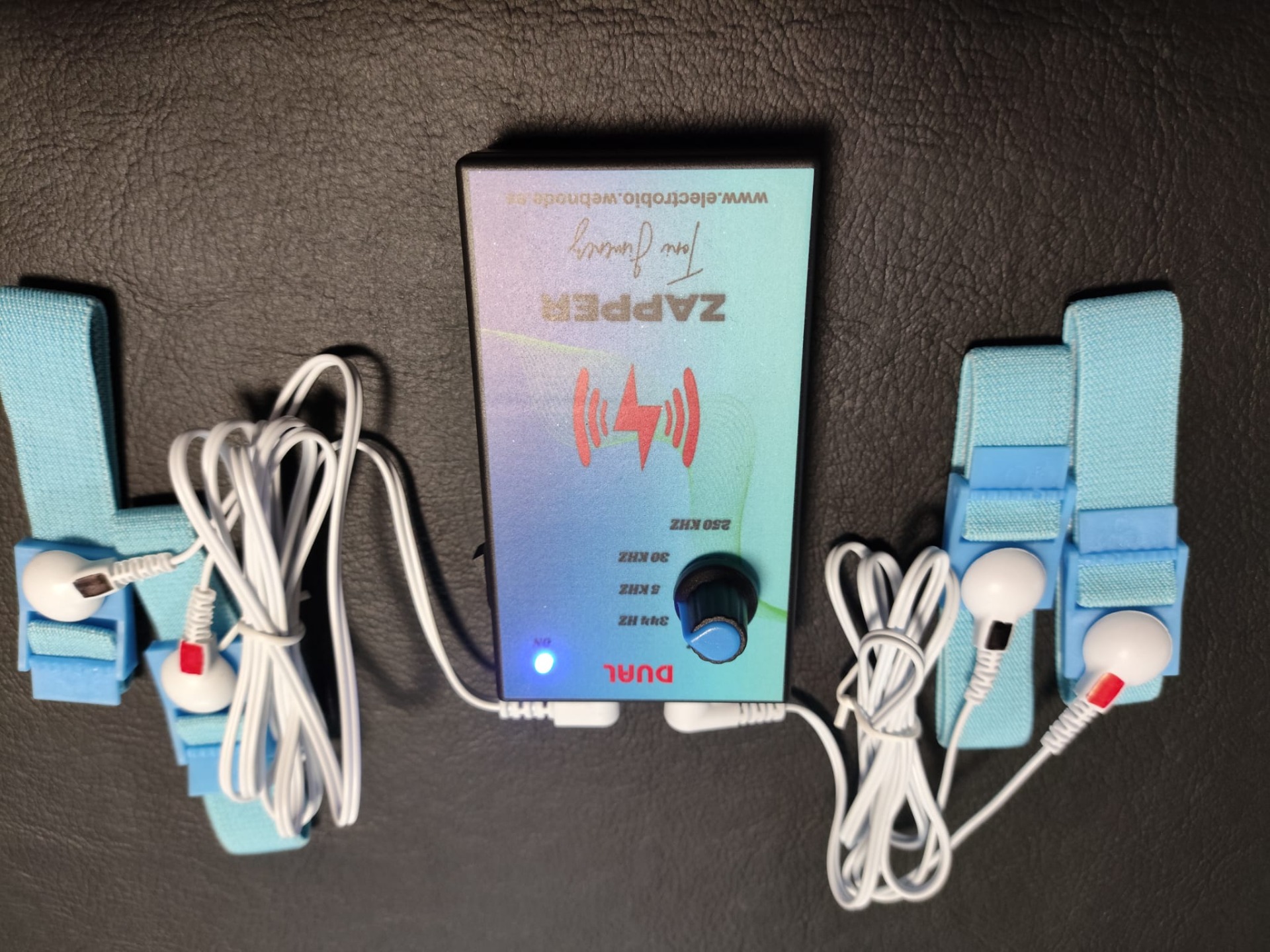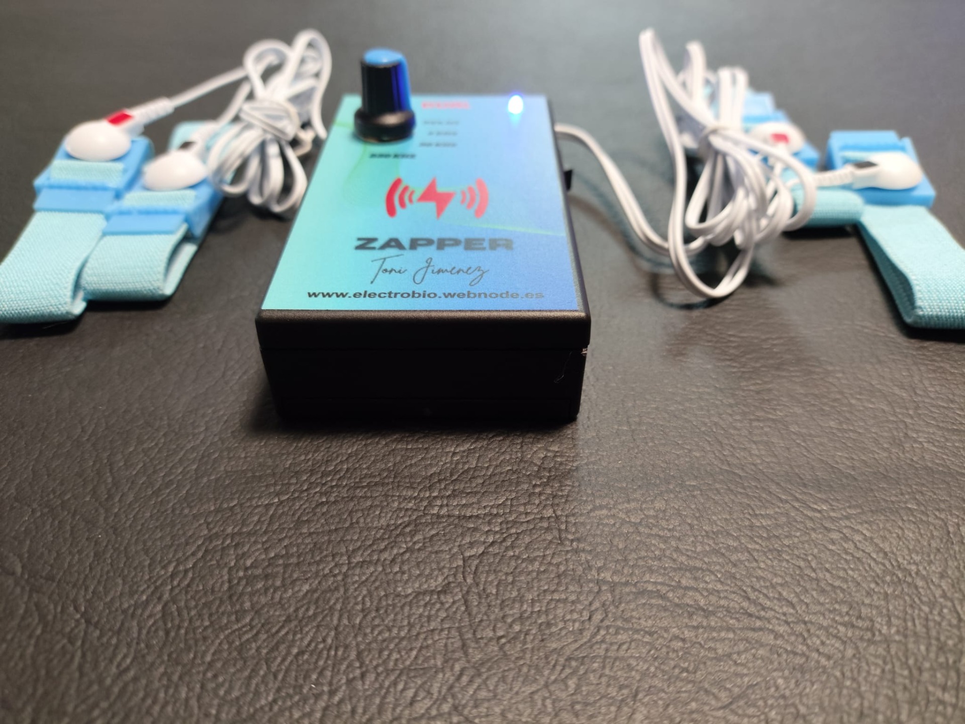 Es un Zapper 5 frecuencias desde los 33 Hz hasta los 250 Khz, honda cuadrada, offset positivo. Lleva la frecuencia de 30 Khz de Hulda Clarck. Funciona con una pila de 9 voltios (no incluida) Incluye pulseras - electrodo para muñecas y tobillos a la vez, consiguiendo un zapeado integral en todo el cuerpo. Equipo robusto y fiable. Longitud de los cables 87cm.